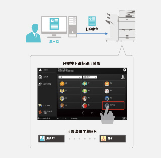 在主機上注冊用戶后,無需每次輸入用戶名和密碼,只要選擇觸摸屏上的圖標,即可輕松完成登錄認證。發(fā)送打印任務后,用戶帳號會自動登錄到設備,以輕松使用個性化功能。