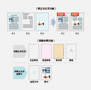 搭載跳過空白頁功能。掃描時可自動檢測原稿中多余的空白頁,生成不含空白頁的文件。使用兩種檢測方法,讀取原稿中的底色和文字、圖片等的輪廓,對透背的文字和淺色文字都能準確識別。