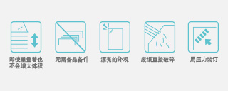 裝載了環(huán)保又安全的“無釘裝訂”功能。采用壓紙方式,最多可裝訂4頁紙。因為是將紙壓住進行裝訂的,所以即使紙重疊著也不會增加體積。另外,輕輕擦一下裝訂部位就能非常容易地分離開。