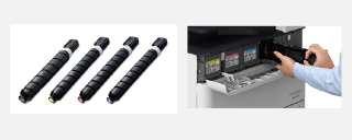 與以往的產品相比,采用不弄臟雙手即可更換碳粉的小口徑IAP 碳粉瓶。改變供應口附近的瓶體容積,有效利用該處產生的空氣的力量,通過這種空氣輔助方式實現(xiàn)小口徑但穩(wěn)定的碳粉供應。此外,通過省去保護蓋,可減少更換時的工作量,提升操作效率,同時也有助于減少廢棄物。