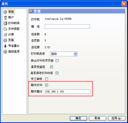 【此項(xiàng)設(shè)置表示:凡是使用這臺(tái)打印機(jī)機(jī)的打印任務(wù),都將啟用刷卡打印功能?!?br /> 在打印機(jī)列表中,找到需要進(jìn)行刷卡打印控制的打印機(jī),右鍵-屬性(或雙擊進(jìn)入屬性),在常規(guī)欄內(nèi),勾選“刷卡打印”,并在“刷卡器IP”中填入刷卡器的IP地址?!咀ⅲ核⒖ㄆ鱅P請(qǐng)見“eMPrint刷卡器的配置.doc”中的設(shè)置】