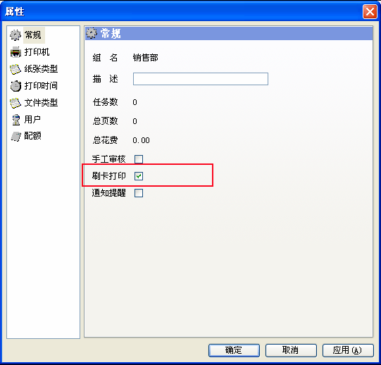【此項(xiàng)設(shè)置表示:該組(或部門)內(nèi)的所有用戶打印時(shí),都將啟用刷卡打印功能?!?br /> 選中要啟動(dòng)刷卡功能的部門,勾選刷卡打印。這樣該部門內(nèi)的所有用戶打印時(shí),都需要刷卡后方可打印。