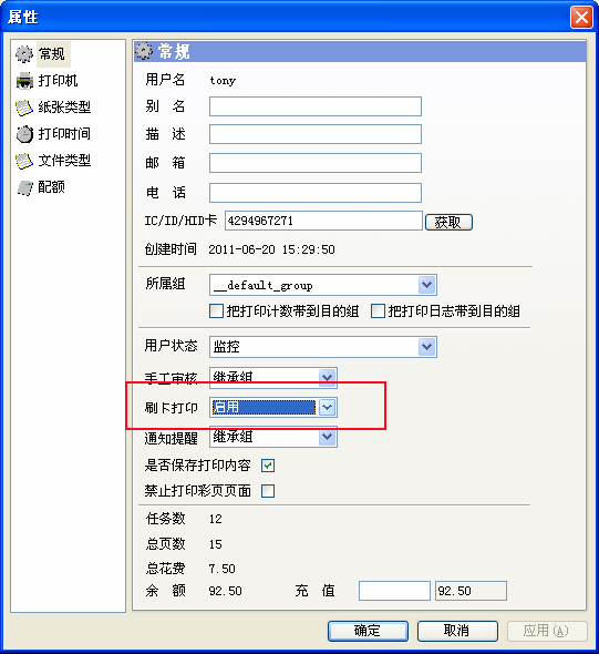 【此項(xiàng)設(shè)置表示:設(shè)定的用戶打印時(shí),將啟用刷卡打印功能?!?br /> 找到某用戶,雙擊進(jìn)入用戶屬性窗口,常規(guī)欄中,刷卡打印選擇“啟用”,則該用戶的所有打印作業(yè)都需刷卡后方可打印出來。