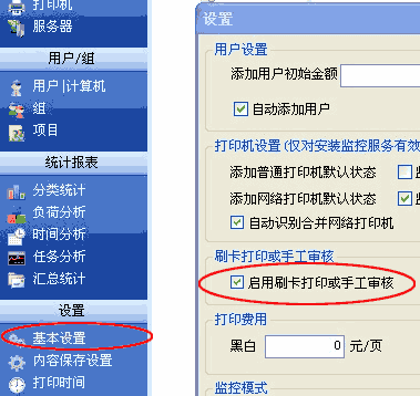 操作:“設(shè)置-基本設(shè)置”中,勾選“啟用刷卡打印或人工審核 ”。若此選項(xiàng)不勾選,所設(shè)置的刷卡打印功能將不會(huì)生效。