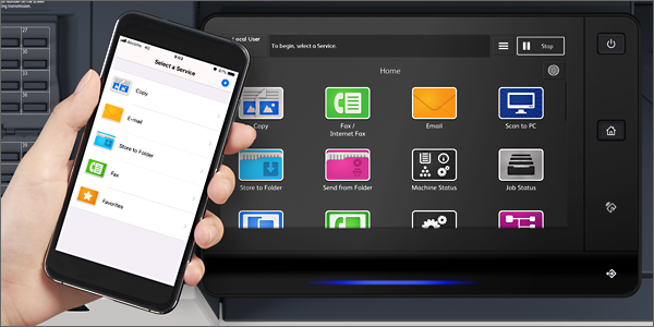 智能手機(iOS和AndroidTM)可用作便攜式UI面板。只需在智能手機上設置作業(yè),然后輕觸多功能一體機的NFC(近場通信)區(qū)域,即可執(zhí)行復印、掃描和傳真(存儲到文件夾或電子郵件)等基本操作。
